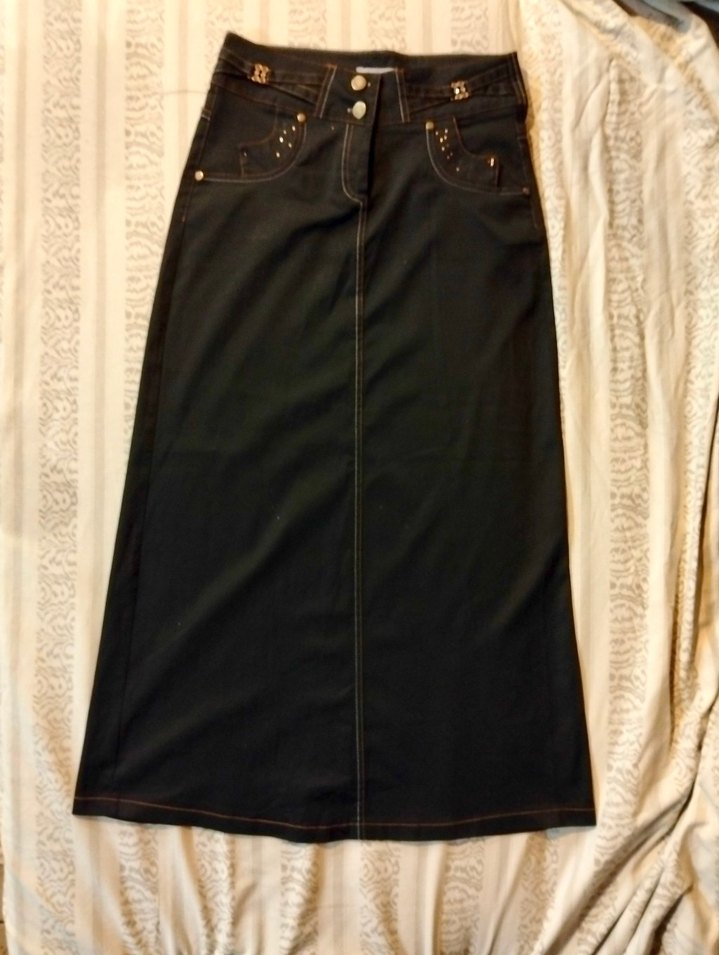 Siyah uzun etek, rahat kesim ve kemerli. Sentetik kumaştan, gotik tarzda, günlük kullanıma uygun. Bazı pulları düşmüş fotoğraflara ekledim.