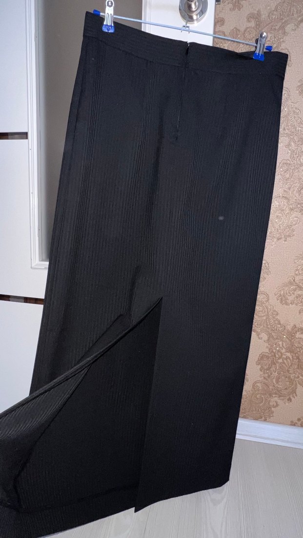 Siyah uzun etek, yırtmaç . Düz ve iş stiline uygun, şık ceket kumaştan üretilmiştir.