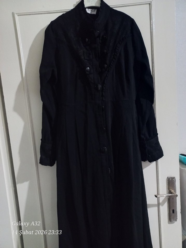 Kadın ferace ygs kardeşler ürünü 40.42 uyumlu kurdelenin düğmesi düşmüş arkasında camasir suyu veya pas lekesi gibi leke mevcut bilerek aliniz namaz icin değerlendirilebilir Uzunluk 135 cm koltuk altı 48. cm gelmektedir