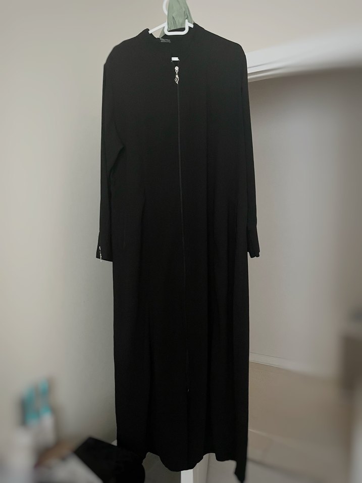Siyah, uzun ve bol kesim kadın ferace Uzun kollu, yaka detaylı ve fermuarlı, günlük tarzda kullanacak bir parçadır. 1950 ye alındı her hangi bi Yerinde sorun yok sadece fermuaranın alt kısmı biraz açıldı terziye yaptırılır fotoğrafta gözüküyot zaten