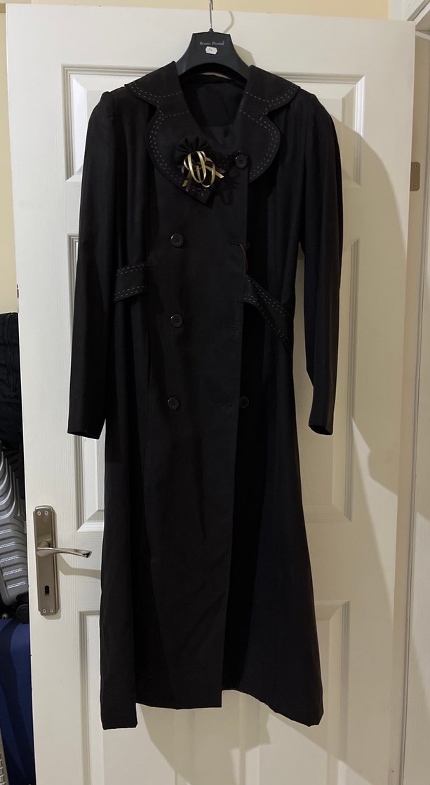 Siyah, uzun boy, düğmeli kadın kaban. Notlu yaka ve uzun kollu, ipeksi dokuda, klasik şıklık için regular fit kesim. Etiketi üzerinde hiç giyilmedi