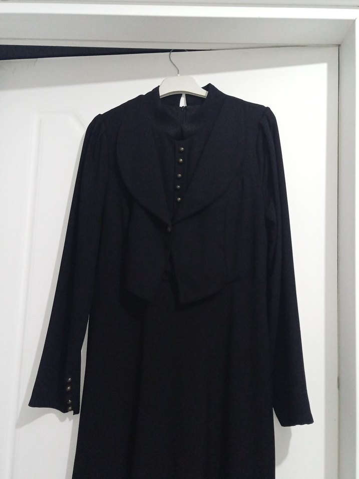 Siyah uzun kadın kaban, yakasında kesik detay ve düğmeli ön kısmı ile dikkat çeker. İpek gibi yumuşak kumaştan, klasik gotik ofis tarzı için uygundur.