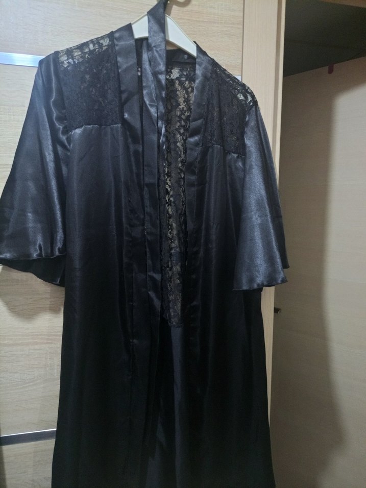 Bu uzun siyah sabahlık, gevşek kesimi, askılı kolları ve dantel detaylarıyla gotik tarzı yansıtıyor. Düz, koyu ve pürüzsüz bir kumaştan üretilmiştir.