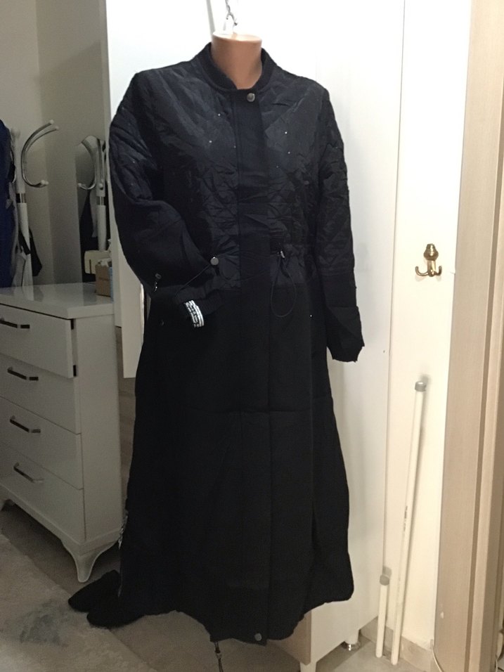 Bu uzun siyah kaban, drapeli tasarımı, yakası ve uzun kollarıyla gotik tarzda şık bir görünüme sahiptir. Rahat kesimli ve ipeksi dokuludur.
