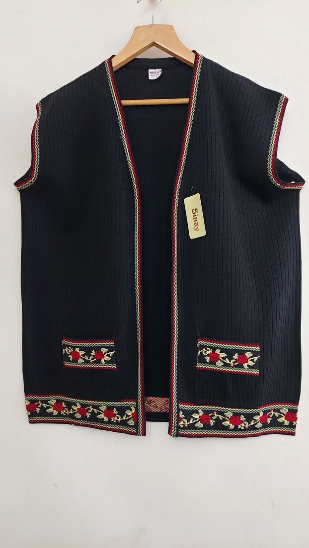 Kolsuz siyah güllü desenli yelek ve çiçek desenleri bulunur. Triko dokusu ve rahat kesimiyle cepli rahat kullanım kolaylığı sağlayan bir üründür.