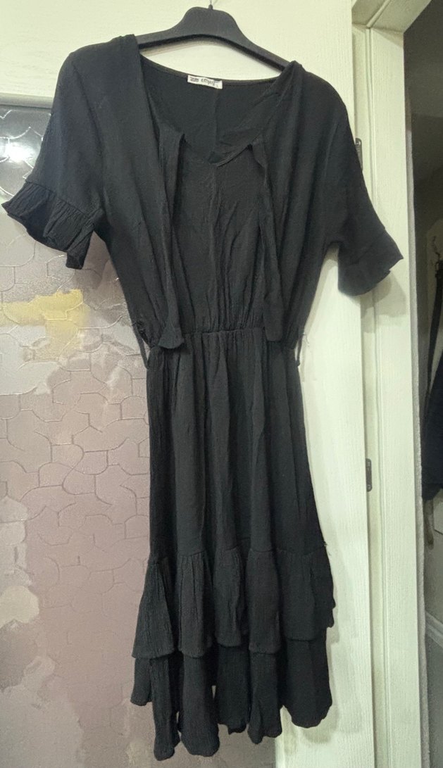 Siyah uzun boy kadın elbise, kısa kollu, V yakalı ve fırfırlı detaylara sahip. Yumuşak keten kumaştan, bol kesim ve gotik tarzda, günlük kullanıma uygun.
