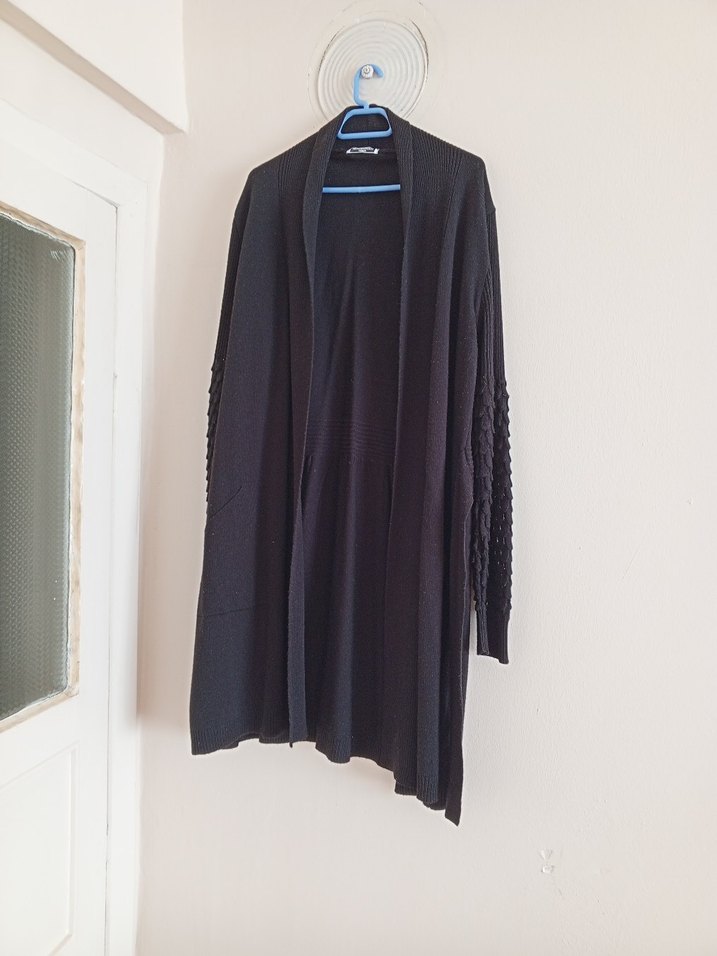 Siyah, uzun boylu kadın hırka, bol kesim ve uzun kollu. Keten kumaştan, yakasında kesimli yaka bulunur. Günlük kullanım için drapeli, minimal ve normcore tarzda.standart beden