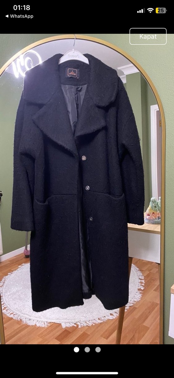 Siyah renkli, yumuşak ve sıcak kumaştan uzun kadın kabanı. Geniş yakalı, önünde düğmeli kapama ve cepleri bulunur. Sarı kaban satıldıı!