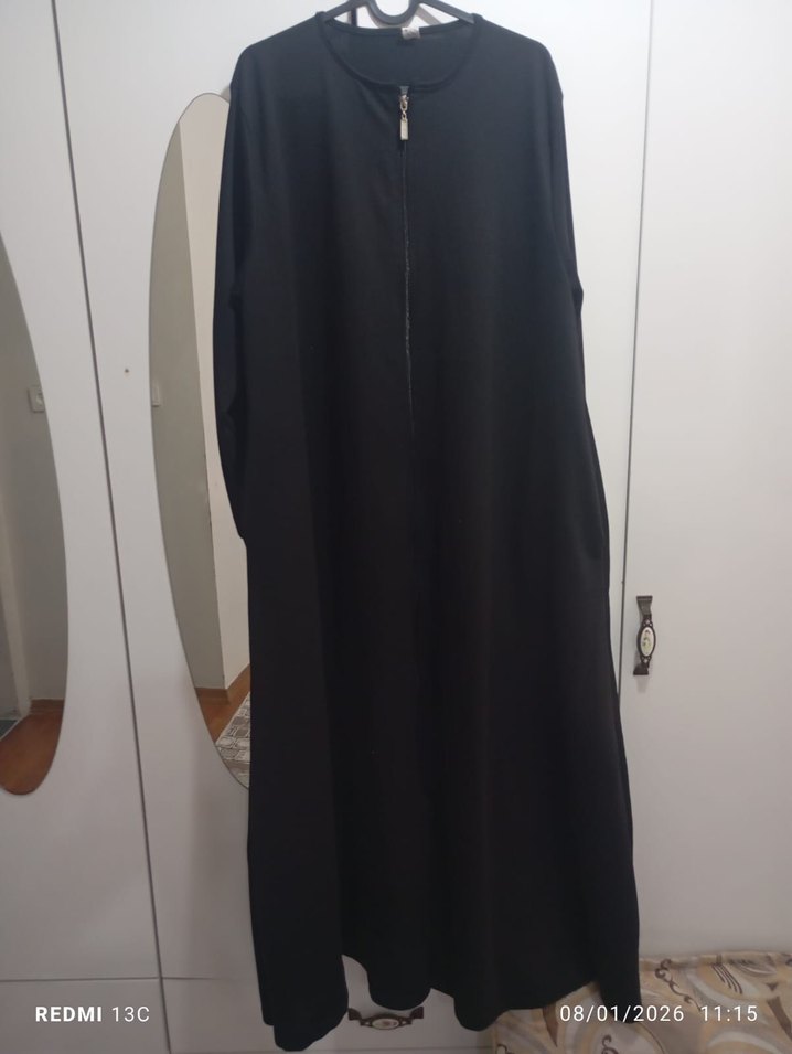 Siyah uzun kadın kaban, drapeli tasarıma, yuvarlak yaka ve uzun kollara sahiptir. Sentetik kumaştan üretilmiş, sade ve minimalist tarzda günlük kullanıma uygundur.