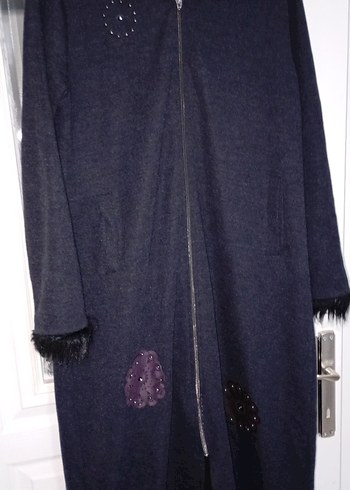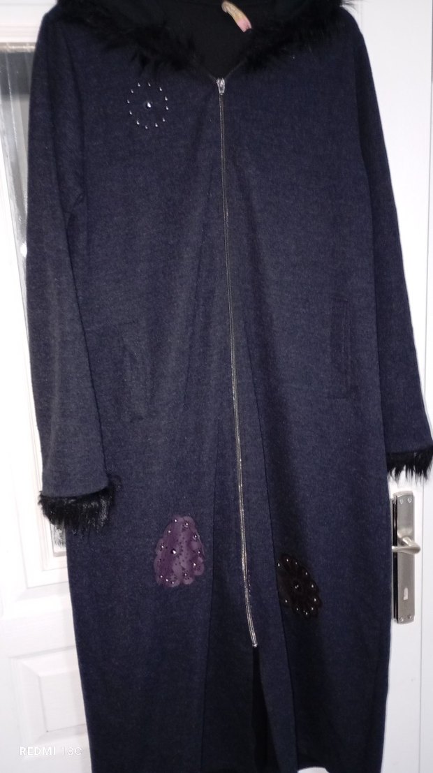 Uzun, siyah kadın kaban, bol kesim ve yumuşak, sıcak kumaştan. Uzun kollu, kürklü manşetler ve kesimli yakalı, rahat ve günlük kullanım için uygundur.