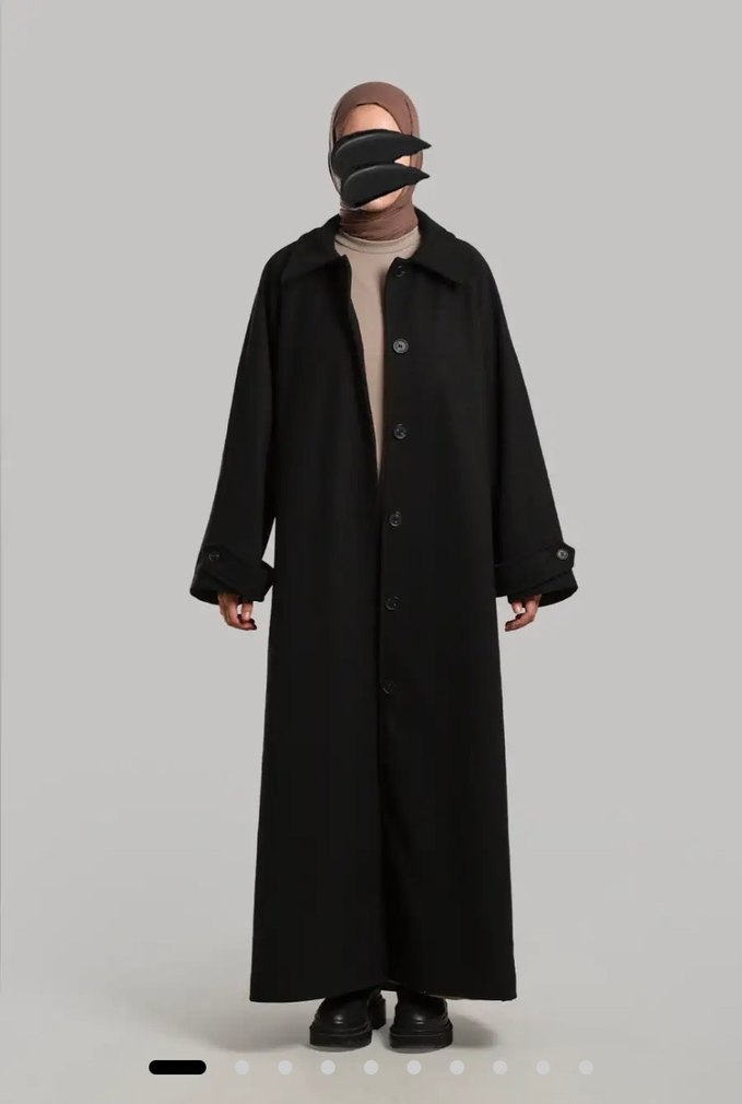 Siyah uzun kadın kaban, notched lapel yaka ve uzun kollu, rahat kesimle günlük kullanıma uygun yumuşak ve sıcak kumaştan üretilmiştir. Ürünün detaylı fotoğrafı atılır. Yaklaşık 1 kullanıldı.