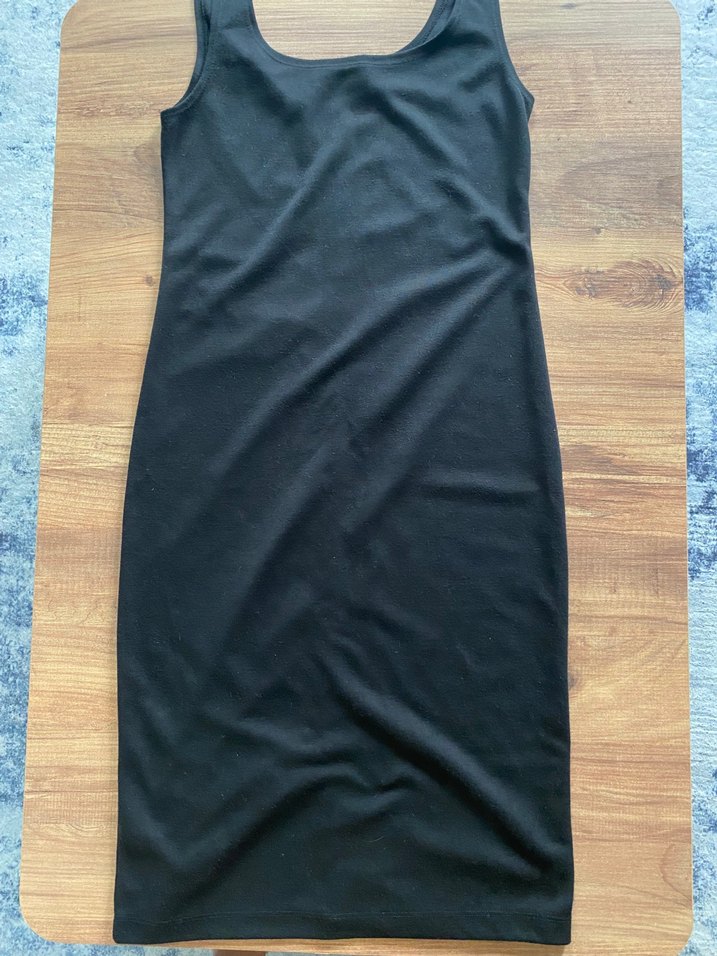 Siyah, kolsuz, kayık yaka kalem elbise. Pürüzsüz sentetik kumaştan üretilmiş, vücuda oturan kesimi ve minimalist tarzı ile günlük kullanıma uygundur. Arkasında yırtmacı bulunmaktadır