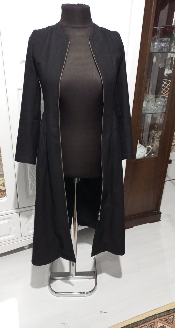 boy 122 cm göğüs 44 cm bel çevresi 38 cm kalça 56 cm kol dirsek 15 cm 36 beden Siyah, uzun, keten görünümlü yok bir kumaş çok güzel duruşu fermuarlı ön detaylı kadın kap Ofis için ve iş stiline uygun, regular fit ve uzun kolludur. günlük kullanıma uygun olacaktır