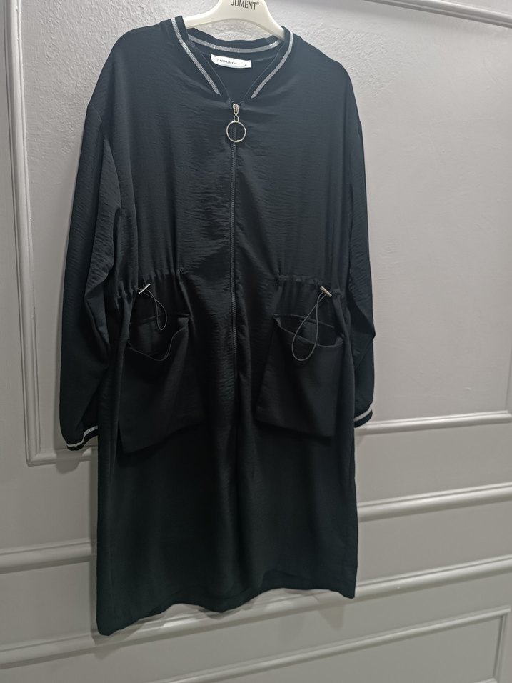 Siyah uzun kadın tunik, bol kesim, kemerli bel, uzun kollu ve yuvarlak yaka detaylarına sahiptir. Ceplerde bağcık ve halka fermuar bulunmaktadır. Pürüzsüz sentetik kumaştan, sokak modasına uygundur.