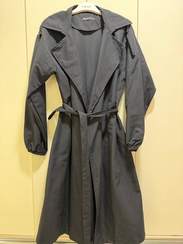 Siyah keten kumaştan uzun, drapeli, notched yakalı, bol kesim kadın trençkot. Ofis ve sokak stiline uygun.L-Xl bedenlerine uyumludur