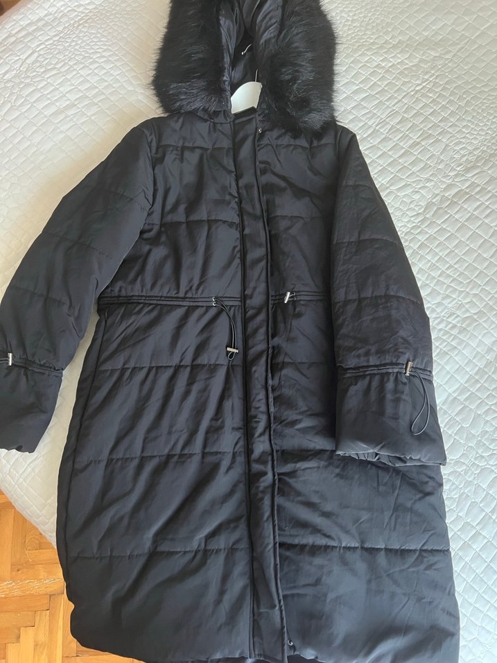 Siyah uzun kadın mont, kürklü kapüşon ve askılı kollara sahip, yumuşak ve sıcak kumaştan yapılmış rahat bir sokak giyimi tarzında.