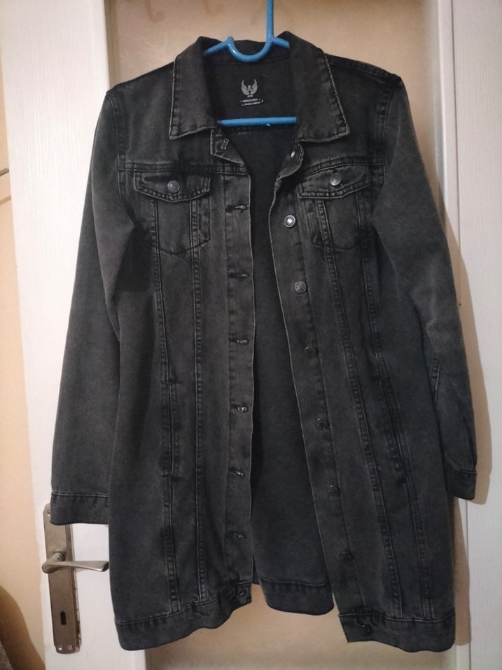 Siyah kot kumaştan, düğmeli ve uzun kollu, notched yaka detaylı, bol kesim kadın ceket. Günlük kullanıma uygun, salaş ve şık tarzda.
