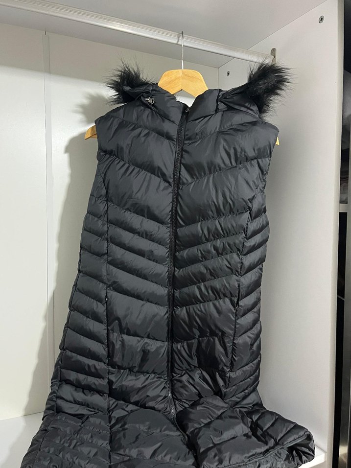 Siyah renkte, uzun kesim ve fitted olan bu yelek, yakalı ve kapüşonunda kürk detaylarına sahiptir. Kolsuz ve yumuşak sentetik kumaştan üretilmiştir, rahat sokak giyimi için uygundur. Cep kısmında sökük vardır