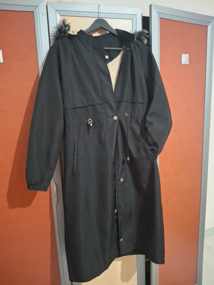 Siyah uzun kadın mont, düğmeli ön ve kapüşonlu, bol kesimdir. Sentetik kumaştan yapılmış, günlük sokak stili için uygundur.