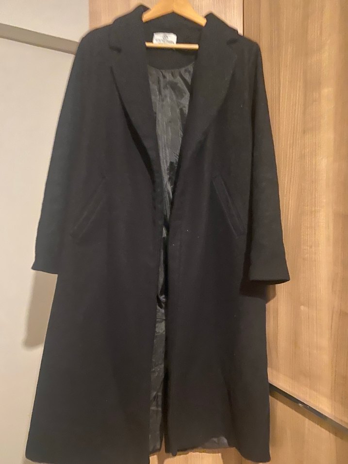 Siyah, uzun kesim kadın palto; yakalı, dökümlü ve ipeksi kumaştan, klasik zarafet ve gotik tarzıyla ofis için uygun.