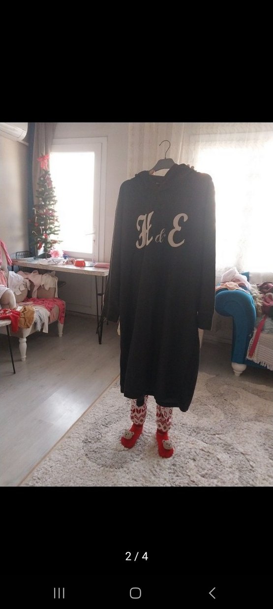 Siyah renkli, uzun ve bol kesim kadın bornoz, kapüşonlu ve baskılı detaylara sahip rahat sokak stiliyle tasarlanmıştır.