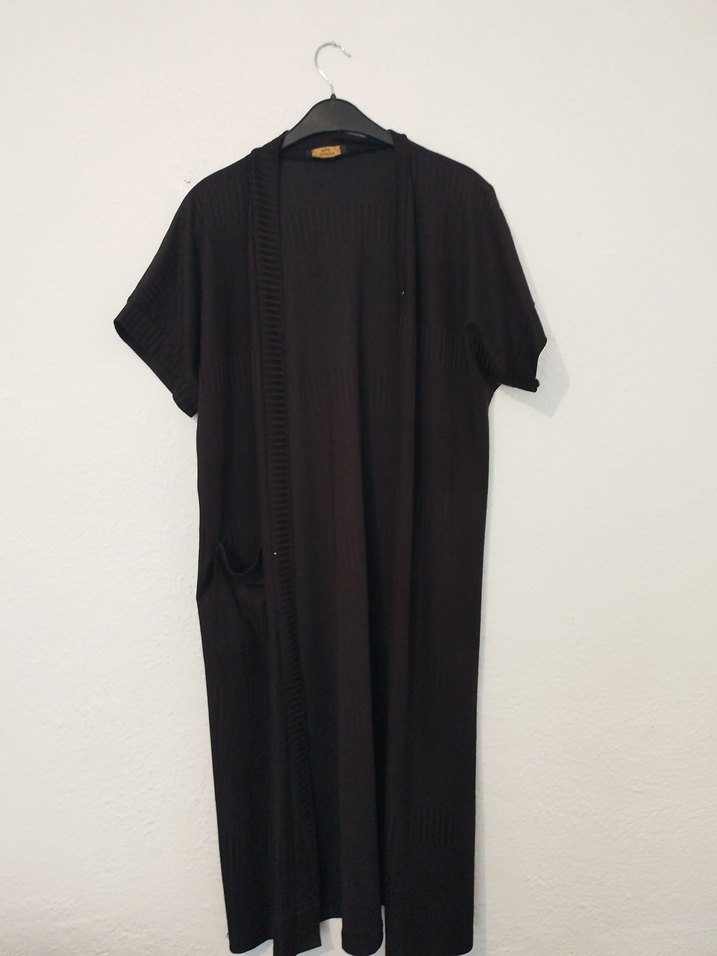 Kısa kollu, salaş kesim siyah uzun kadın kimono, minimalist sokak stili için uygundur. Desensiz ve cep detaylıdır.
