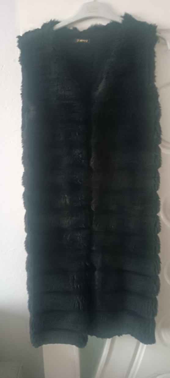 Siyah uzun suni kürk yelek, tekne yaka ve askılı kollu, sentetik kumaştan üretilmiştir. Günlük kullanıma uygun, rahat ve gotik tarzda bir tasarımdır.