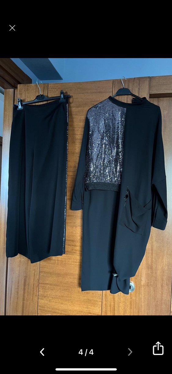 Siyah renkli, yandan kısa arkası uzun bol kesim etek pantolon ikili takım hiç giyilmedi . Notched lapel yaka, uzun kollu, ipeksi kumaş ve drapeli tasarıma sahip . ✨