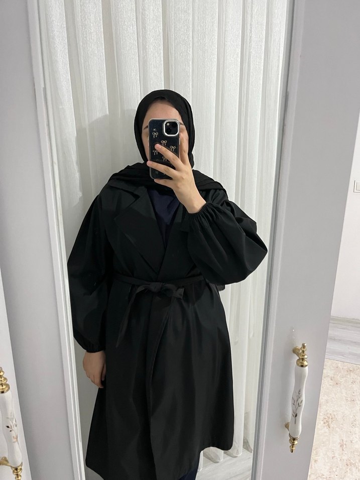 Yüksek yakalı, drapeli uzun siyah kadın trençkot, ipeksi kumaştan, bol kesim ve uzun kollu. Minimalist, sade tarz için uygun.