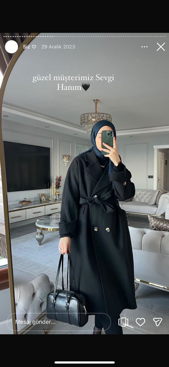 Kumaşı çok kaliteli sıfıra yakın çok az giydim. Siyah uzun kaban, yakalı ve kemerli, rahat kesimdir. Uzun kollu ve yumuşak, sıcak kumaştan yapılmıştır. Günlük kullanıma uygundur.