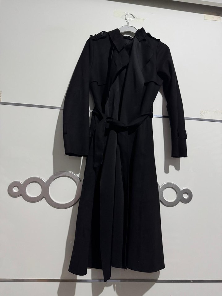 Siyah uzun kadın trençkot,drapeli ve kesik yakalıdır.Yumuşak ve sıcak kumaştan yapılmış,regular fit ve uzun kolludur.Günlük kullanım için uygundur.Boyu 100 cmdir.