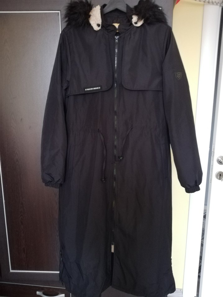 Siyah uzun kadın trençkot kapüşonlu ve kürk detaylıdır. Gevşek kesim, uzun kollu ve fermuarlı ön cepheye sahiptir. Beli sıkılabilir. Kolu lastiklidir. Etek uçlarında yandan fermuar detayı vardır