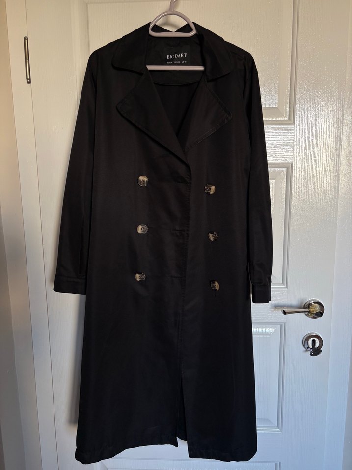 Siyah uzun kadın trençkot, yakasında kesik yaka ve düğmeli ön detaylar bulunur. İpeksi kumaştan, klasik ve gotik tarzı birleştirir, ofis için uygundur.