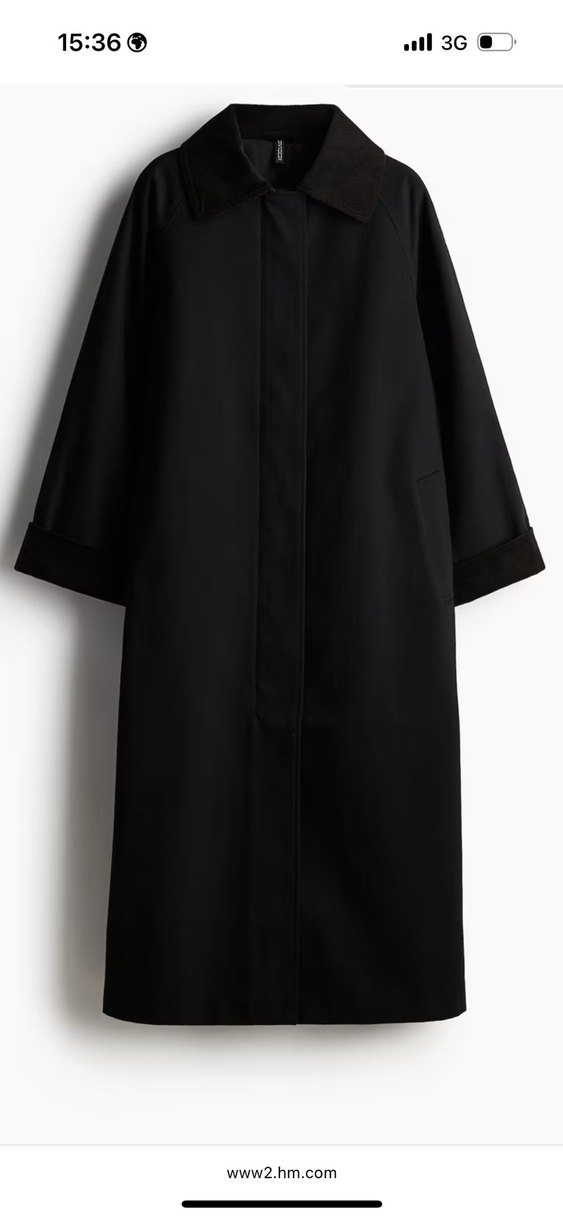 Siyah uzun trençkot. Klasik yaka ve uzun kolludur, oversize model.