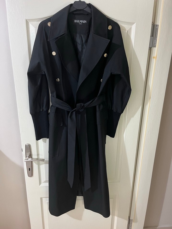 Balmain imzalı, kemerli, kesik yaka detaylı, uzun kollu, siyah kadın trençkot. İpek gibi dokusu ve klasik şıklığıyla ofis kullanımı için ideal.