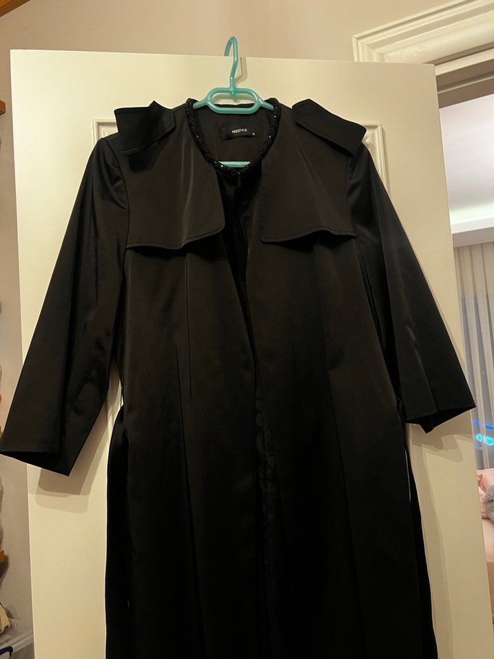 Siyah uzun kadın trençkot, yakasında drapeli detay ve keskin yaka bulunur. Sentetik kumaştan, regular fit ve uzun kolludur.