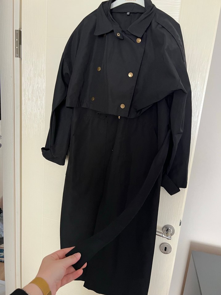 Düğmeli, notched lapel yakalı, sentetik kumaştan yapılmış, bol kesim siyah uzun kadın trençkot. Hem yelek hem trenç ikili kullanım