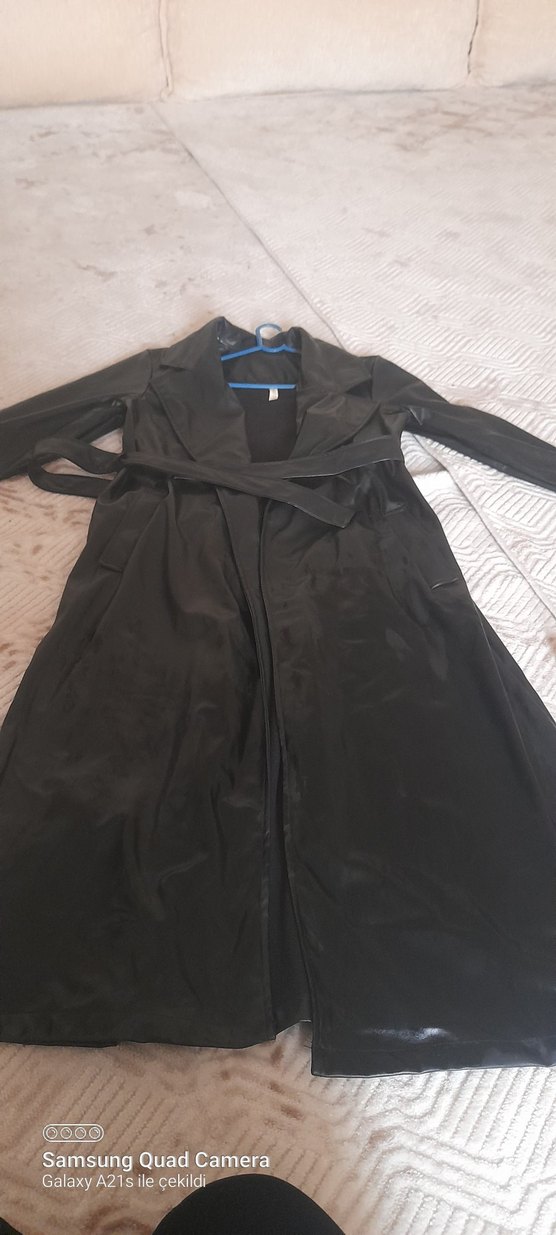 Siyah, uzun ve fitted kesim trençkot, drapeli detaylar ve notched lapel yakaya sahip. deri kumaştan, gotik ve şık tarz için ideal.