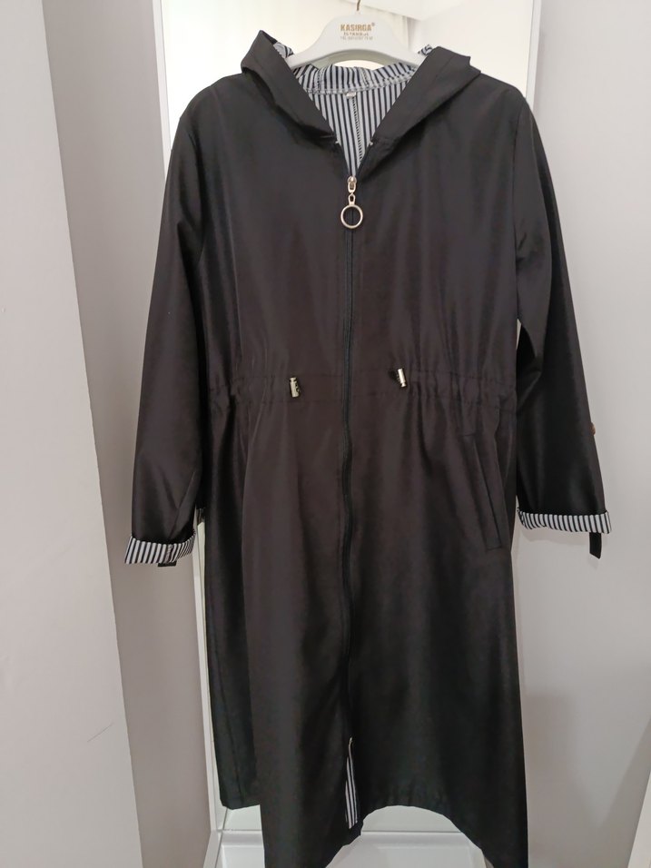 Kadınlar için uzun, bol kesim siyah yağmurluk, kemerli ve çıtçıtlı kapamalı. Gri çizgili astarı, günlük kullanıma uygun