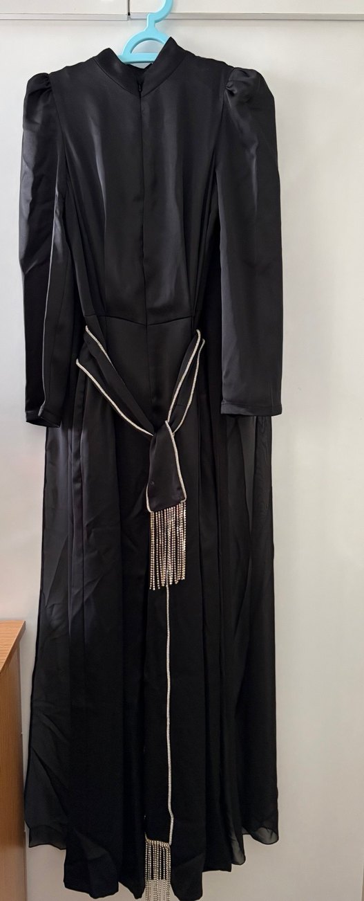 Siyah uzun pelerinli tulum, yakalı ve uzun kollu, ipeksi kumaştan. Püskül detaylarıyla kemeri şık hava katıyor.