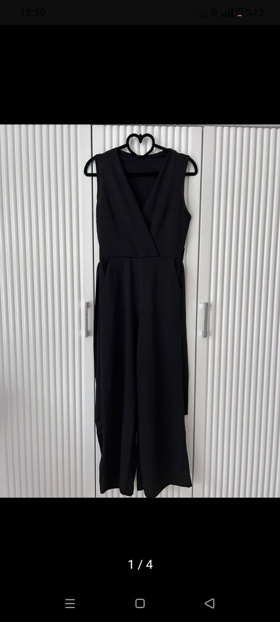 bir kez giyildi hiçbir sorunu yok.Siyah uzun kadın tulumu V yaka, ince askılı ve kemerli. İpeksi kumaştan, regular fit, ofis için minimalist ve şık goth tarzı.