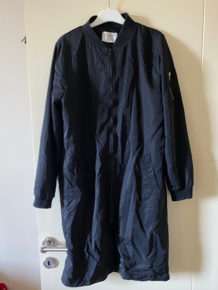 Siyah uzun kadın ceketi, bol kesim ve uzun kollu. Sentetik kumaştan, minimal ve desensiz tasarım, günlük kullanım için uygun.