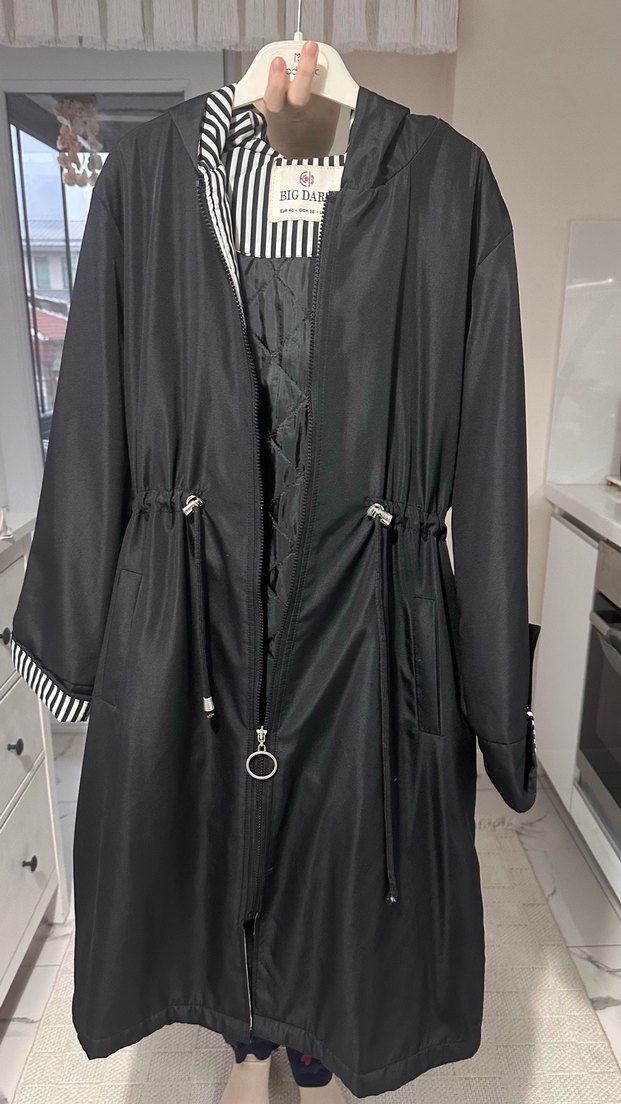 Ürün 1 kere giyildi yenidir kapşonlu yanlardan daraltılıp büyüyebilen büzgülü siyah renk uzunluk-103 cm
