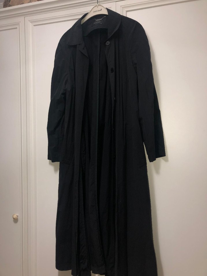 Siyah uzun ince kumaştan, bol kesim ve drapeli kadın palto. Notlu yakalı ve uzun kollu, gotik tarz için uygun.