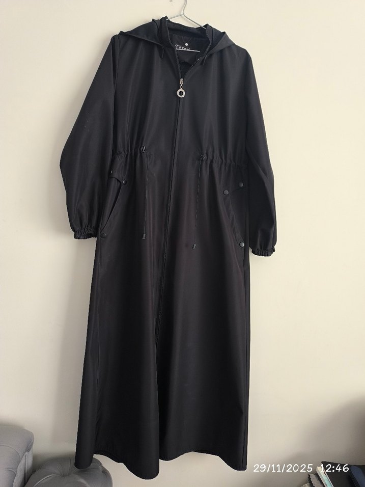 Siyah renk, uzun ve bol kesim kadın trençkot, drapeli tasarım ve uzun kollu, notched lapel yaka ile. Sentetik kumaştan, minimalist gotik tarz için uygundur. 44-46 beden(130- 135) arası boy. fermuar uzunluğu başından sonuna kadar 96 cm. az kullanıldı. deformesi yok temiz ürün, dar geldiği için satıyorum duruşu kalıbı çok güzel.