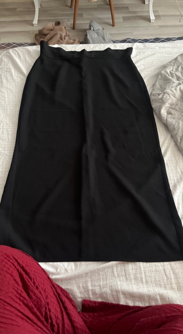 Kalem kesimi ve yumuşak sentetik kumaşı ile siyah, uzun ve vücuda oturan etek. Minimalist gotik tarzda, modaya uygun ve avangart görünüme uygundur.