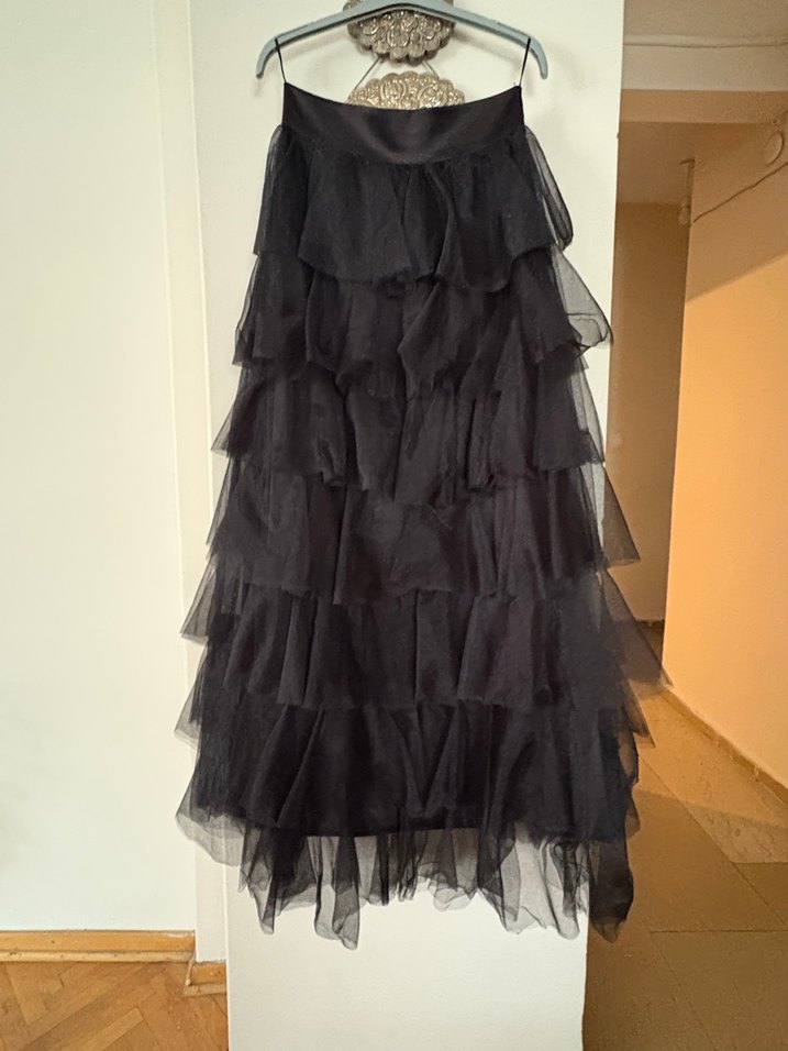 Siyah renkte, sentetik kumaştan, çok katlı fırfırlı uzun etek. Gevşek kesimi ve gotik tarzıyla parti için uygun.