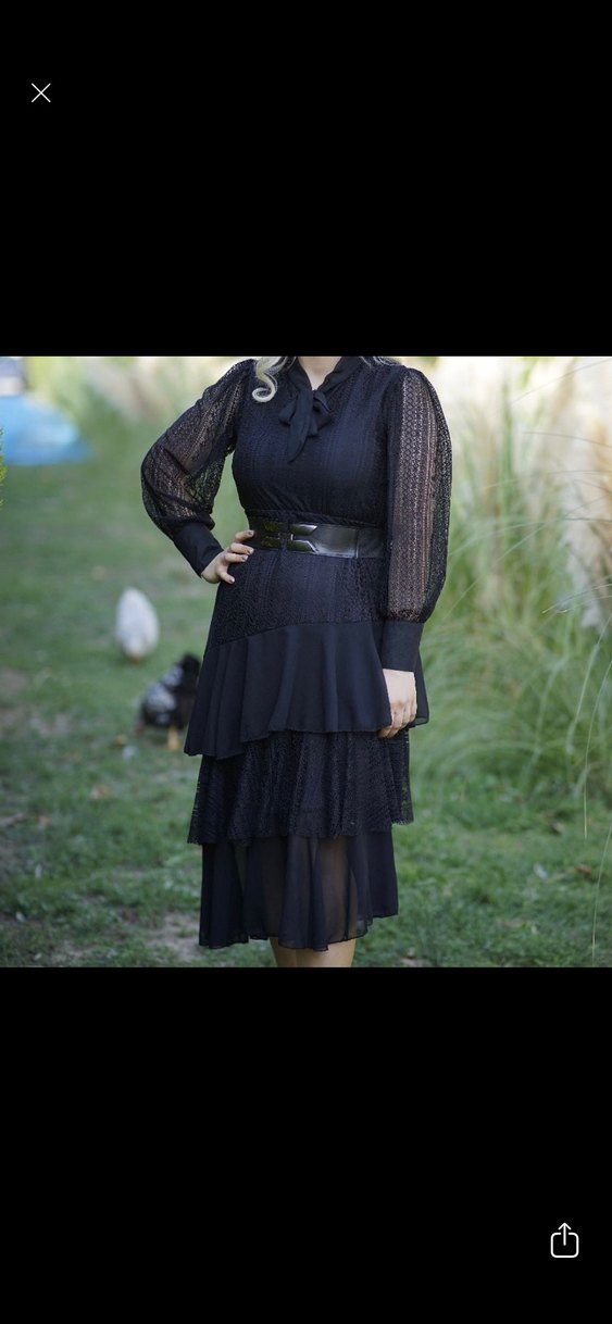 Siyah uzun gotik elbise, katmanlı fırfırlar, transparan desenli kollar ve V yaka ile. Rahat kesim, sentetik kumaş dokusu ve koyu, şık görünüm sunar.