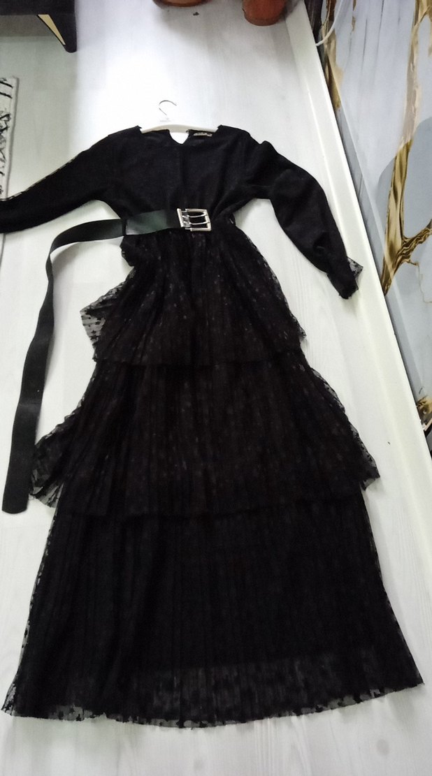 Bu siyah uzun elbise, yüksek yakalı ve bol kesimdir. Katmanlı fırfır detayları ve sentetik kumaşıyla günlük kullanıma uygundur.