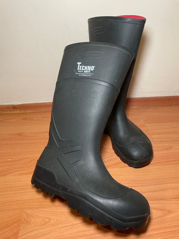 siyah kauçuk uzun botlar, TECHNΟ logosu bulunur. Sokak stiline uygun, desen içermeyen modern tasarım.